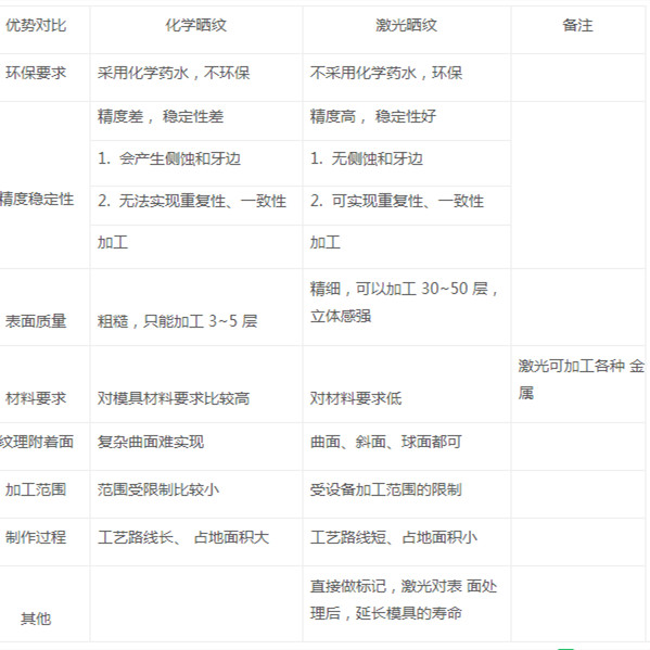 激光晒纹与传统晒纹的优劣势对比图